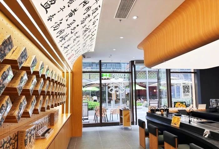 哈茶福长宁首店位于商场一层,延续浅木色中式设计,配以长幅水墨书法,是一处具有中国传统文化底蕴的休闲茶饮空间。头牌红、正山小种、雁荡毛峰红等上百种茶叶可选择,市民可即点即喝,也能坐下来慢慢品茶。目前,店内指定款茶饮低至8折。