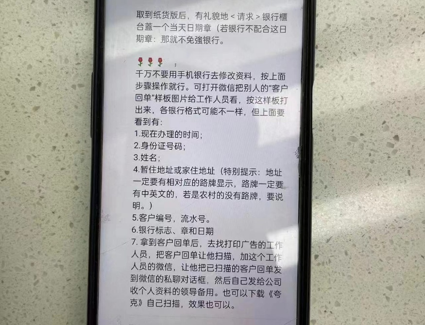 事发当天一早,工商银行银行客户经理小李发现一老年客户神情焦急,询问其办理业务时闪烁其词、表述不清,老人展示了手机微信聊天记录中他人要求其办理的业务,显示了对方详细引导老年客户必须前往柜面办理个人信息更改业务,且打印纸质个人信息回单拍照发送给对方,并提供拒绝自助机具办理业务等相关话术。这些内容显然是有组织有预谋地获取客户身份信息,所以马上引起了客户经理小李的警觉,她立即向网点负责人汇报了情况。