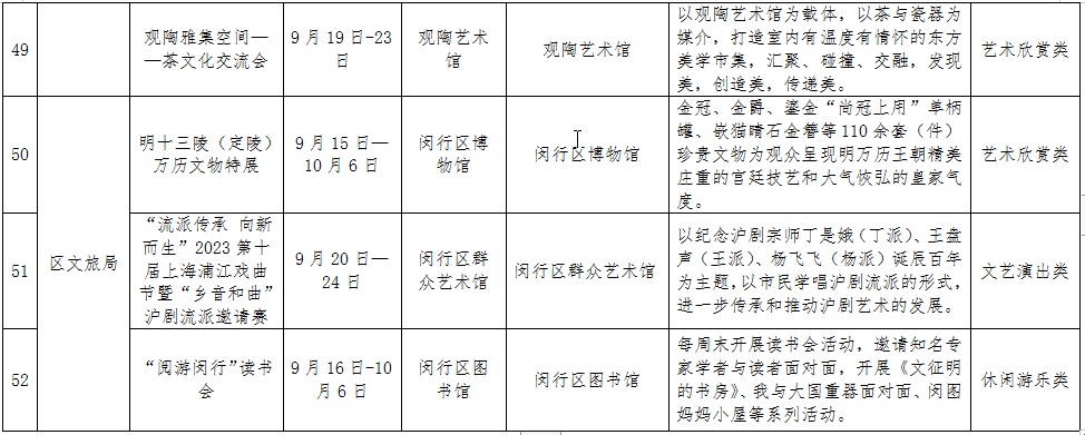 据了解,自今年6月开始,旅游节组委会办公室就通过各镇、街道、莘庄工业区收集征求文商旅企事业单位意见,在保留原有的传统项目和品牌项目的基础上,动员企业策划创新创意项目,策划举办各项活动。根据收集结果及相关意见建议,今年旅游节期间,闵行将举办6大类52项节庆活动,其中美食体验类6项、文创市集类8项、休闲游乐类11项、艺术欣赏类11项、文艺演出类12项、惠民乐购类4项。