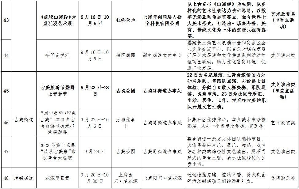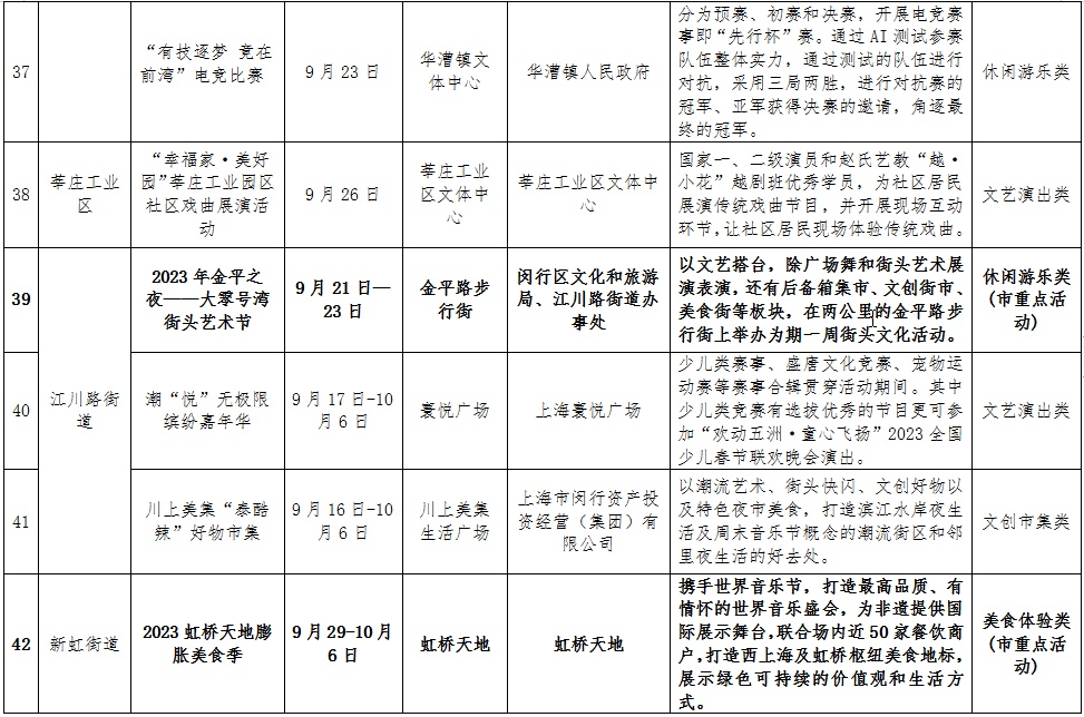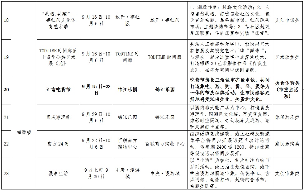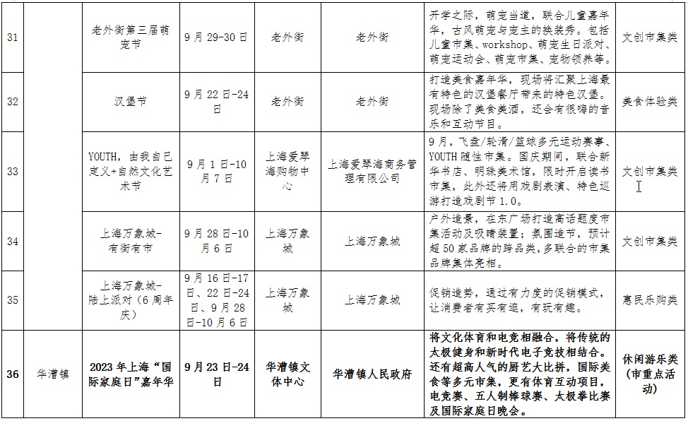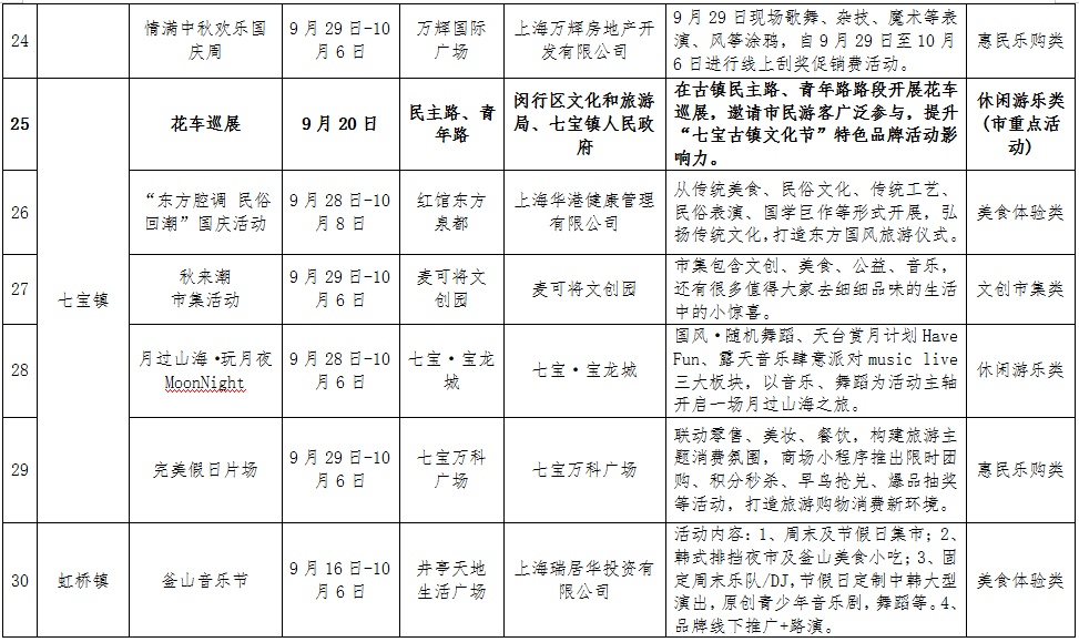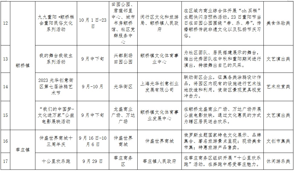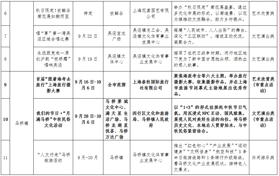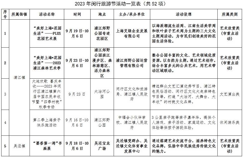 值得一提的是,今年闵行的江南吃货节、“美好上海·花园生活”、“跟着海考去旅行”上海旅行摄影大赛等12项活动还被列入市级重点节庆活动。