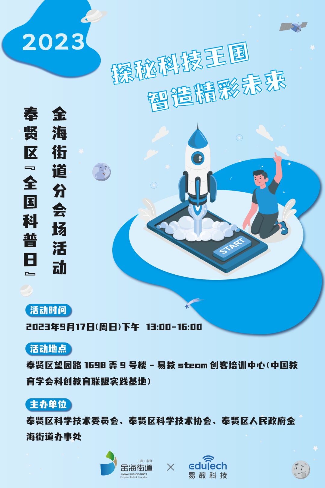 “科创引领 协手未来”——2023年奉贤区“全国科普日”活动启动仪式将于9月20日13:30-15:30开展,活动分仪式部分、ted演讲部分和场外活动部分,仪式部分包括颁奖仪式(第九届全国青年科普创新大赛未来太空车项目颁奖),授旗仪式(为“科普志愿服务队”代表授旗),签约仪式(中国福利会国际和平妇幼保健院与上海市奉贤区奉浦街道办事处签约),项目发布(奉贤区“创新创造梦”梦想项目发布),启动仪式(“创新引领 创造未来”2023年奉贤区全国科普日活动启动仪式)。ted演讲部分包括三大篇章演讲,第一篇章——促发展 聚力科技强国;第二篇章——强自信 心系“国之大者”;第三篇章——勇创新 梦想创造未来。场外活动包括版面展示(国家、市级科学技术奖获奖项目展示)和项目体验(8个区内科普团队设摊和“海之花”各场馆体验活动)。