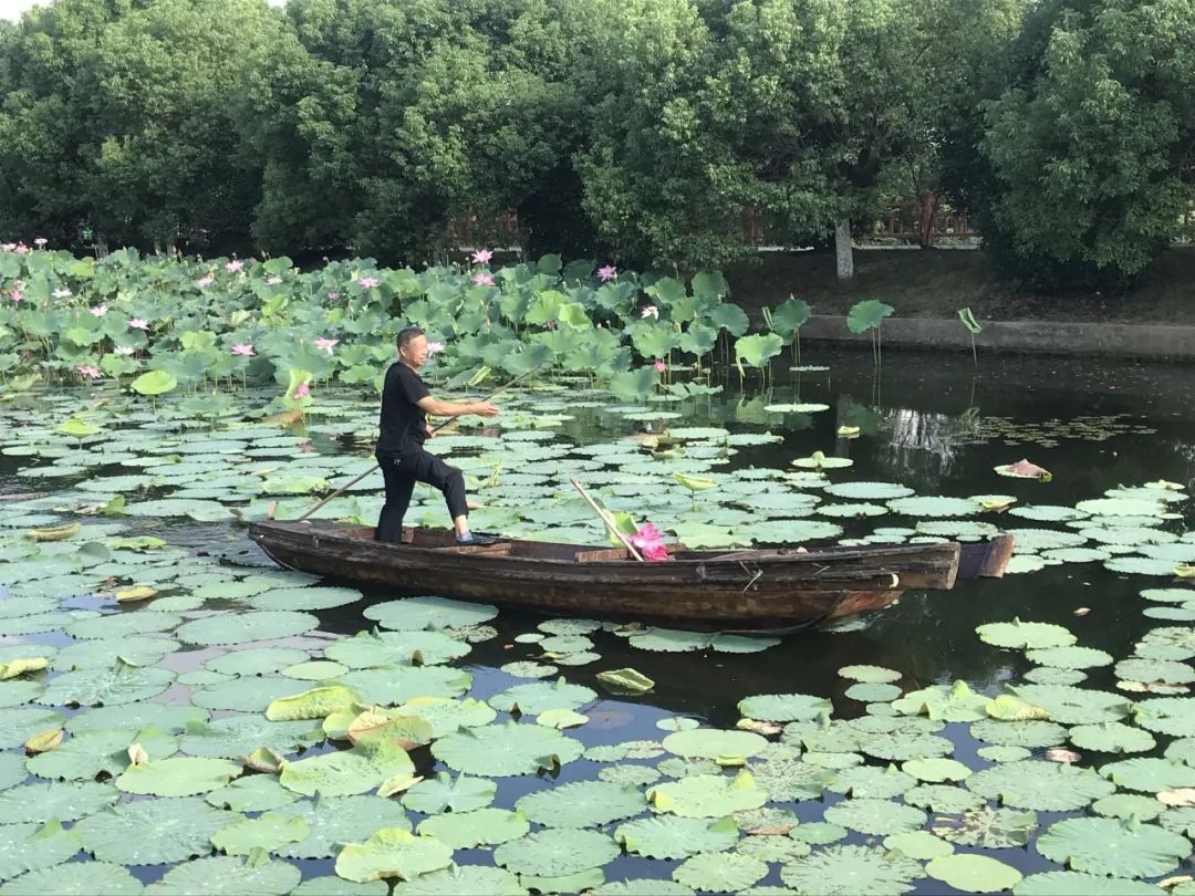 在四团镇小荡村初心亭,荷花连绵不绝、荷叶鲜绿如翡。清晨,微风吹过盈盈碧波,千朵荷花随风摇曳,忽见一人驭一扁舟,穿梭于花海之中,枕着荷叶,拥着荷花,好不惬意。