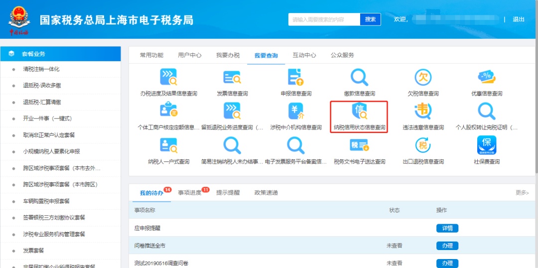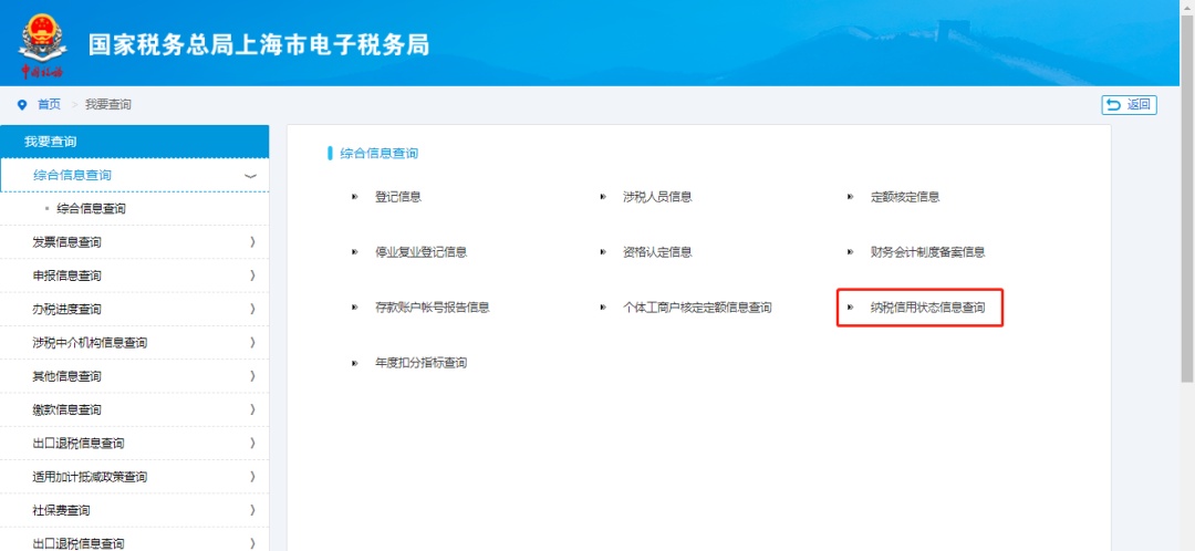 在左侧选择【综合信息查询】,在右侧点击【纳税信用状态信息查询】;