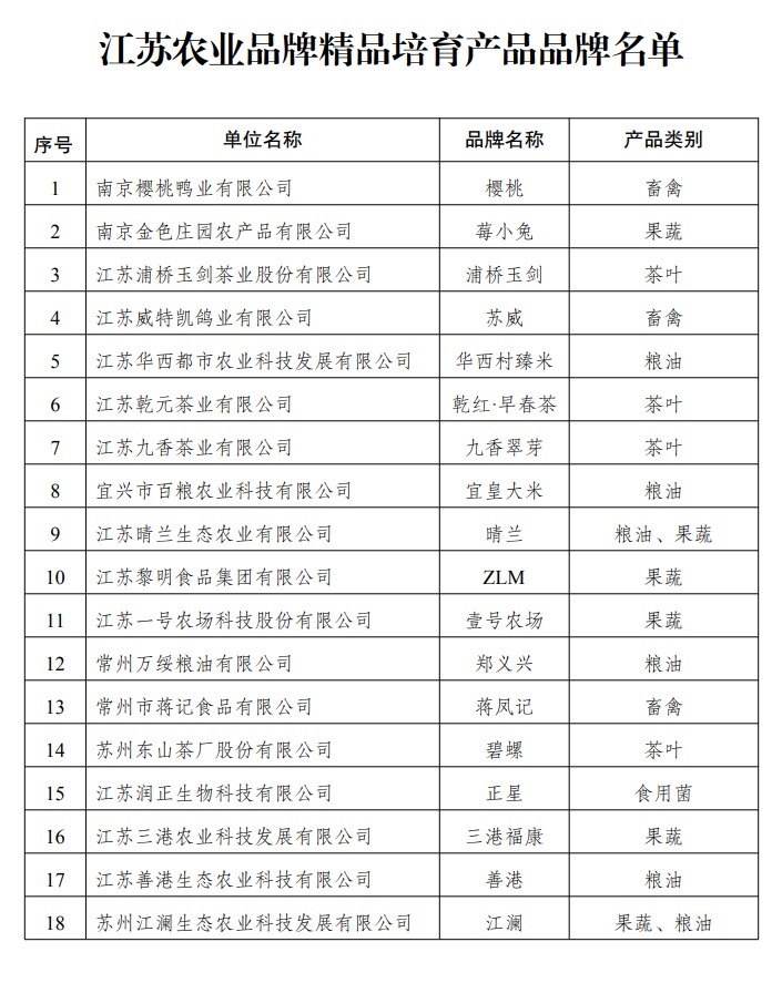 “今年初,我们联合省知识产权局,提出依法规范、高标准培育一批产业优势领先、市场空间潜力大、文化底蕴深厚的农业品牌精品,通过提升品牌基础、营销推广、管理服务、市场消费等方面能力,打造强势农业品牌,放大品牌引领产业增值增收的目标。”省农业农村厅农业品牌工作领导小组办公室主任樊宝洪说,经过层层筛选,此次入选江苏农业品牌精品培育计划的66个品牌集中代表了江苏农业品牌发展的高端水平。下一步,省级层面将对精品培育品牌在产业基础、营销推广、管理服务、市场消费等方面提供支持,各地将在政策制定、规划指导、资金安排、项目建设等方面给予大力扶持,上下联动,将省级农业品牌精品打造成省内闻名、国内知名的“苏”字号农业大品牌。