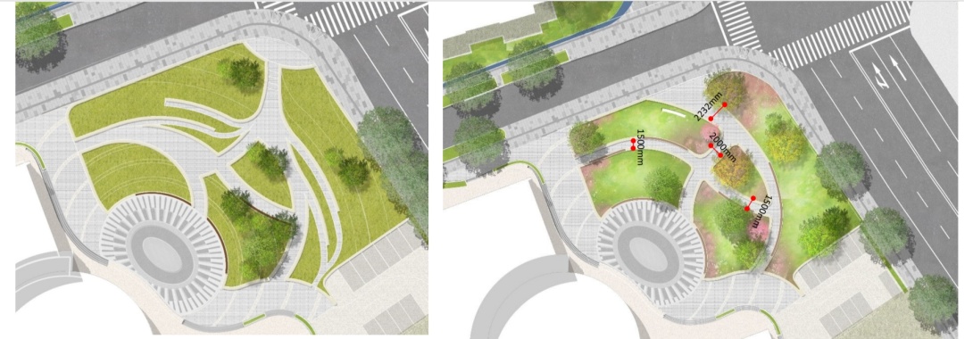 此外,此次改造还调整了入口位置,重新设计了坐凳集合挡墙,在花境区域结合平侧石收边,保留了五月苑路口logo标识等,包括景观、绿化、家具小品多项专项内容,通过对绿地植被、街道铺装、通行流线等现状问题梳理,整合绿地空间、优化交通流线、营造温情花园,让绿色成为城市最动人的底色、最温暖的亮色,塑造桂林西街沿线社区家门口的生活型温情街区新亮点。
