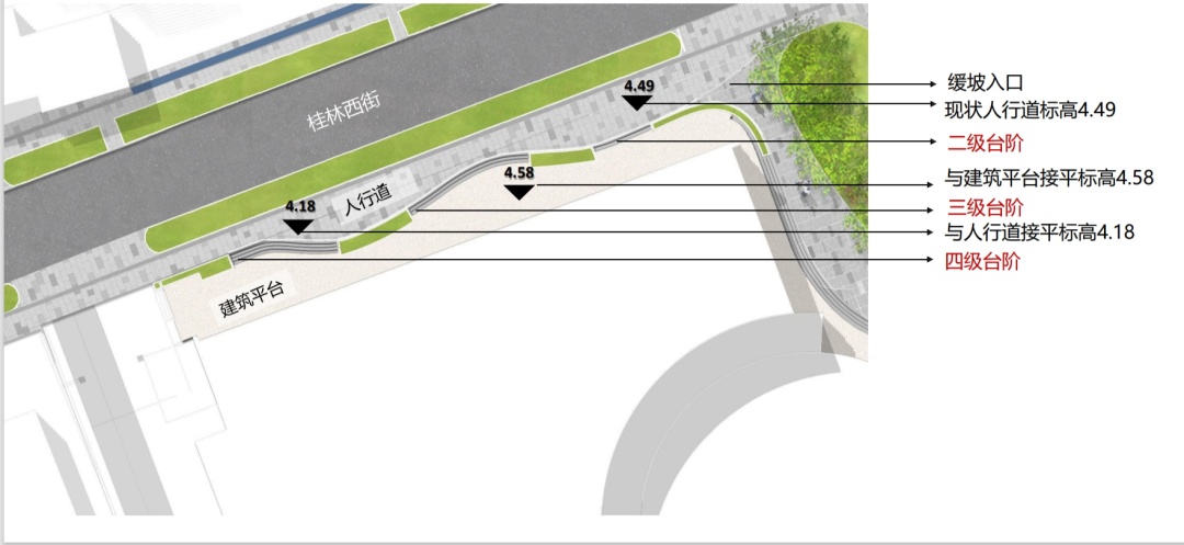 在改造前,建筑周边场地与人行道约有30cm高差,缺乏场地整体性,且存在安全隐患。改造后,通过不同层次的精细设计,利用缓坡和二、三级台阶,将各种高度差巧妙弥补,为居民带来既安全又美观的步道空间。