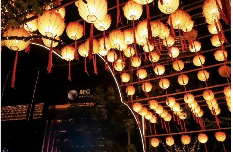 华灯初上,外滩枫径也点亮“千灯万盏”,璀璨光廊与当空明月交相辉映,配搭户外广场萌趣可爱的玉兔灯,与市民游客开启温暖美好的游园之旅。