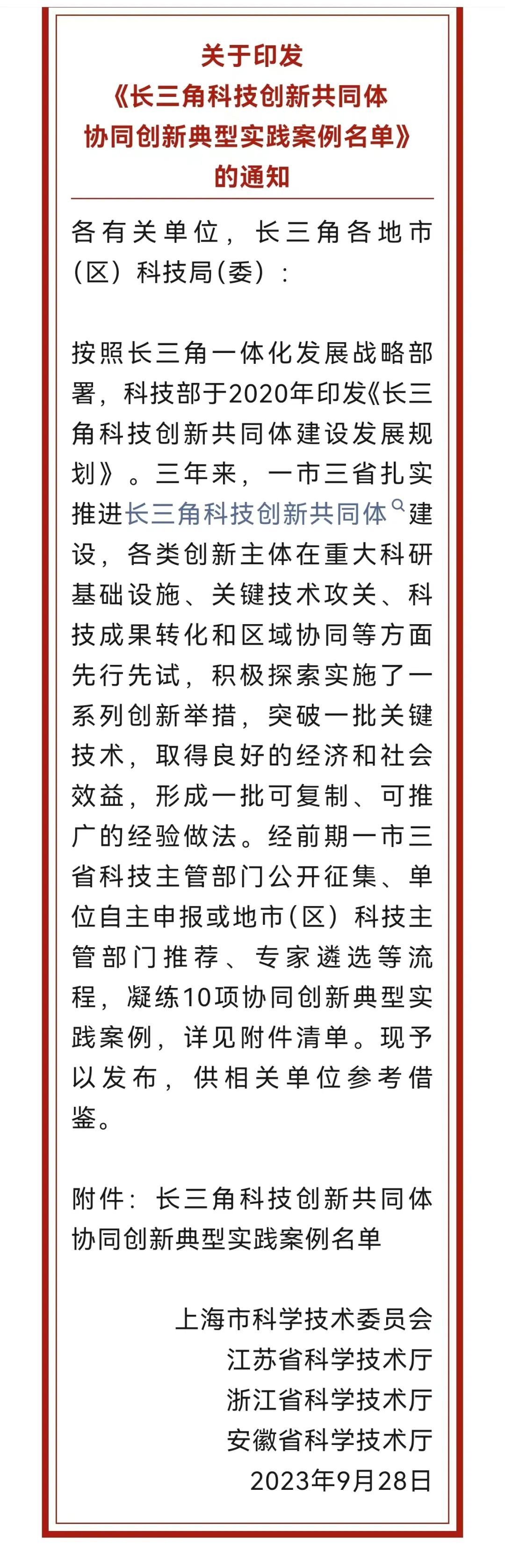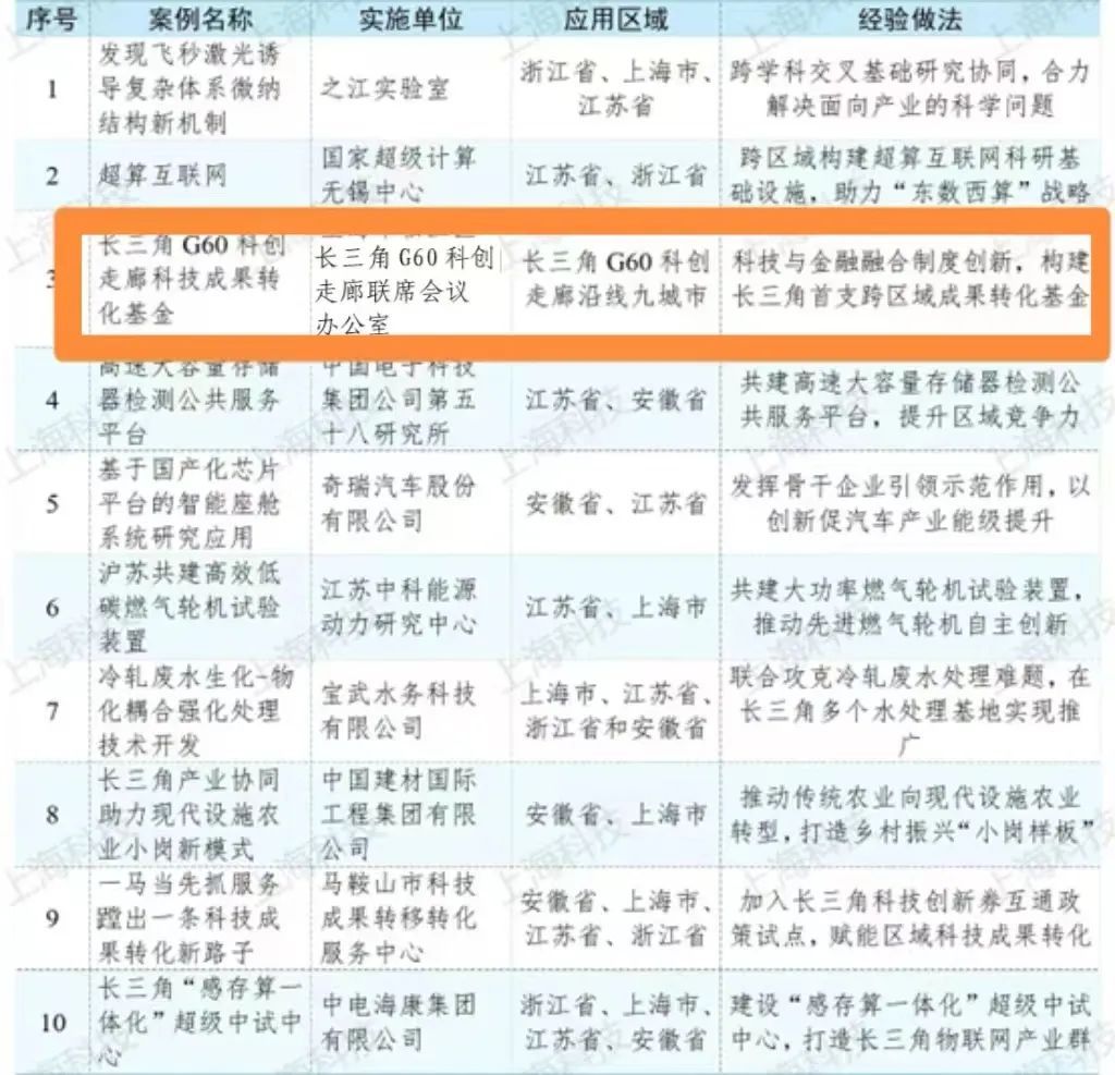 2023年10月7日,长三角三省一市科技厅发布《长三角科技创新共同体协同创新典型实践案例名单》,名单包含10项协同创新典型实践案例,集中展示各类创新主体在重大科研基础设施、关键技术攻关、科技成果转化和区域协同等方面的先进经验做法。长三角g60科创走廊科技成果转化基金成功入选该创新案例!