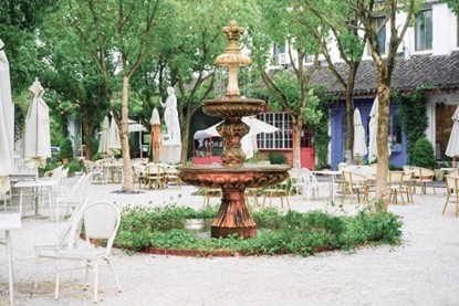 欧式人物雕像、法式石雕喷泉、小碎石子铺就的道路、复古餐车……各式洋溢着法式风情的建筑物、装饰物,与周遭的青山绿水迥异又巧妙地融为一体,来到这里,仿佛开启了一场浪漫的异国之旅。