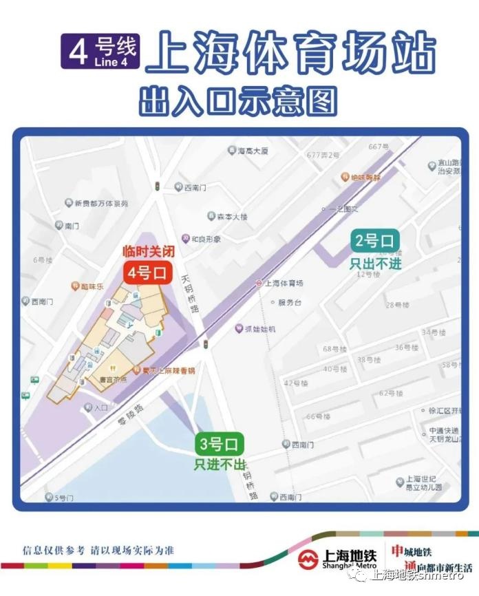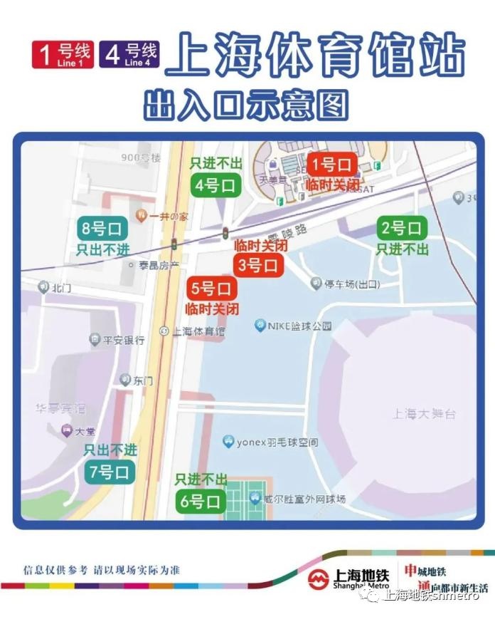 演唱会散场时,以下车站出入口将临时调整。1、4号线上海体育馆站1、3、5号出入口临时关闭,2、4、6号出入口只进不出,7、8号出入口只出不进。4号线上海体育场站2号出入口只出不进,3号出入口只进不出,4号出入口临时关闭。