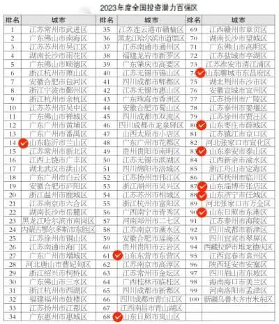 2023年度全国投资潜力百强区榜单中,山东共有9地入选:临沂市兰山区、东营市东营区、日照市岚山区、聊城市东昌府区、枣庄市薛城区、泰安市泰山区、淄博市张店区、济宁市任城区、日照市东港区。