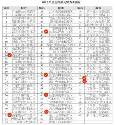 2023年度全国综合实力百强区榜单中,山东共有8地入选:青岛市即墨区、威海市文登区、临沂市兰山区、淄博市临淄区、济南市章丘区、济宁市兖州区、淄博市张店区、东营市东营区。