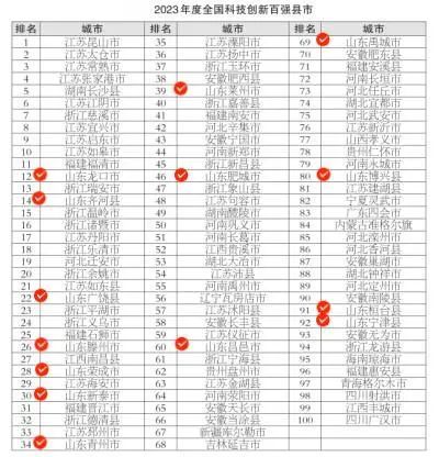 2023年度全国科技创新百强县市榜单中,山东共有14地入选:龙口市、齐河县、广饶县、滕州市、荣成市、新泰市、青州市、莱州市、肥城市、昌邑市、禹城市、博兴县、桓台县、宁津县。