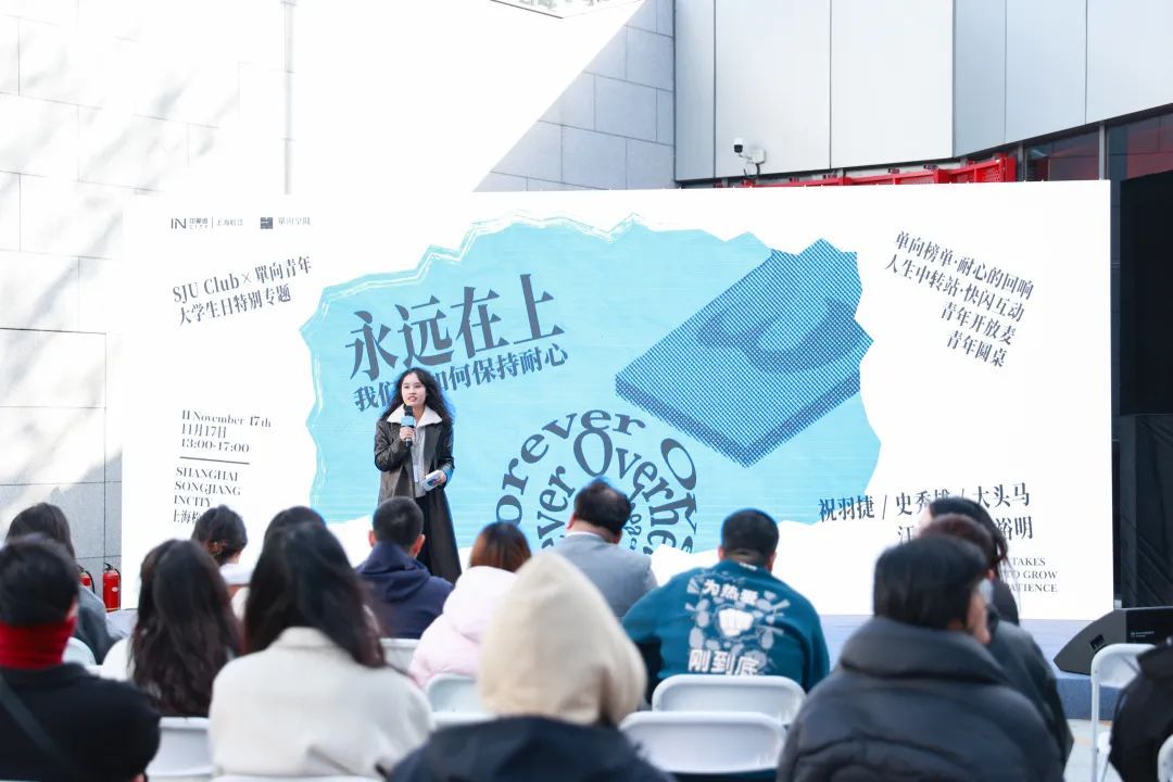 开幕式当天恰逢国际大学生日,毗邻松江大学城、拥有十万“永远年轻”客群的松江印象城联合单向空间,特意为高校学生带来一场名为“永远在上,我们该如何保持耐心”的专题分享,邀请到青年作家、播客主播、青年媒体品牌创始人等不同领域的创作行动者,以一份书单、一系列开放麦、一场圆桌对谈、一次快闪互动,围绕青年生活的不同维度,追问真实世界的运行轨迹,探索关于生活的问题与方法。