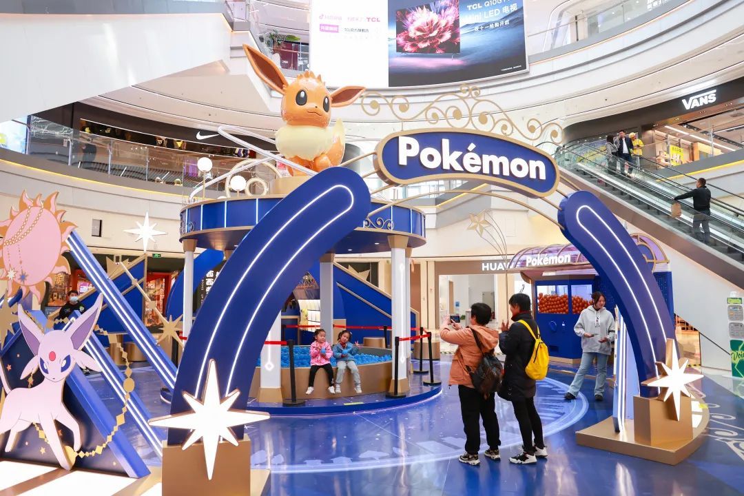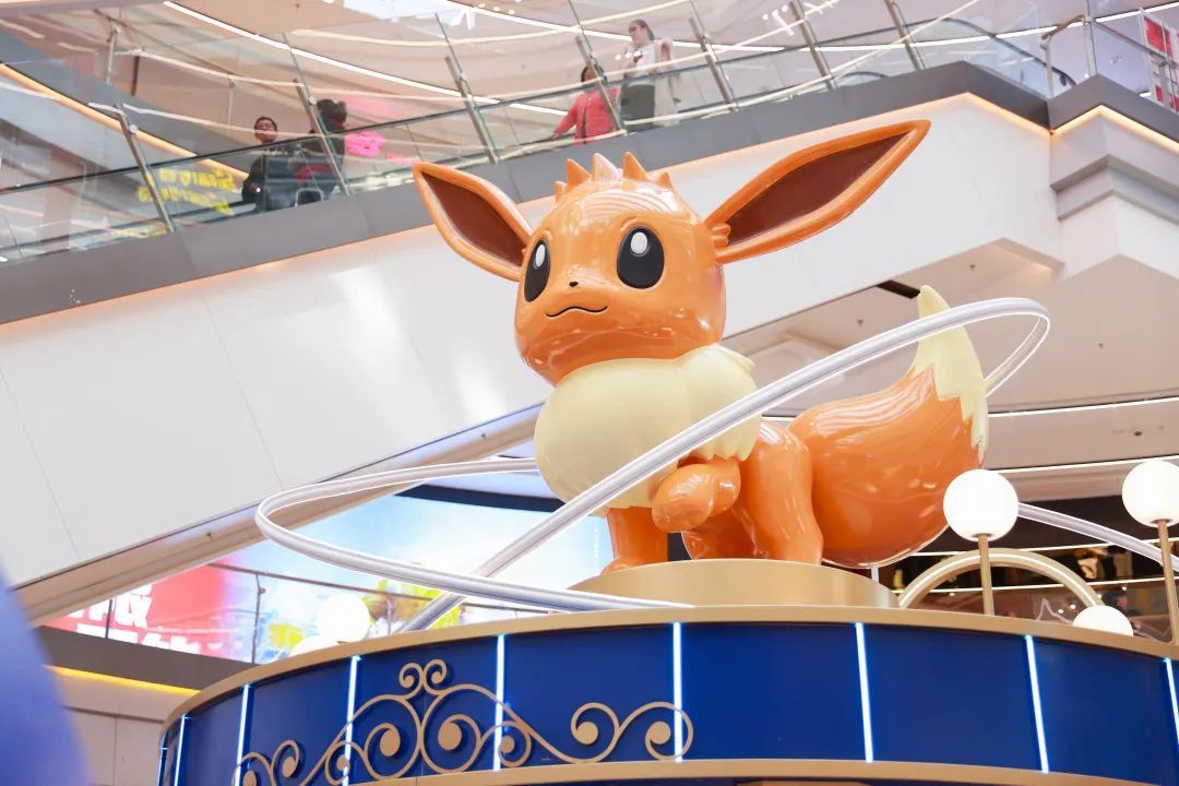 走进b1层剧院广场,首先映入眼帘的是一片以深邃蓝色为主色调的主题装置,宝可梦明星——伊布正于3米之上的高台眺望,仿佛在期待大家的到来。同时,展览围绕伊布的多种进化形态,还精心打造了“幻紫星池”“星夜快闪”“星光精灵球”“奇异之光”“魔法闪耀”“神秘礼物盒”等互动空间,大家可以亲自解锁跨次元的趣味体验,感受伊布的独特魅力。随着音乐声响起,可达鸭、皮卡丘、波加曼等诸多卡通人偶排队登台,和大家挥手互动,勾起不少“80后”“90后”的童年回忆,围观人群里传出阵阵欢呼。
