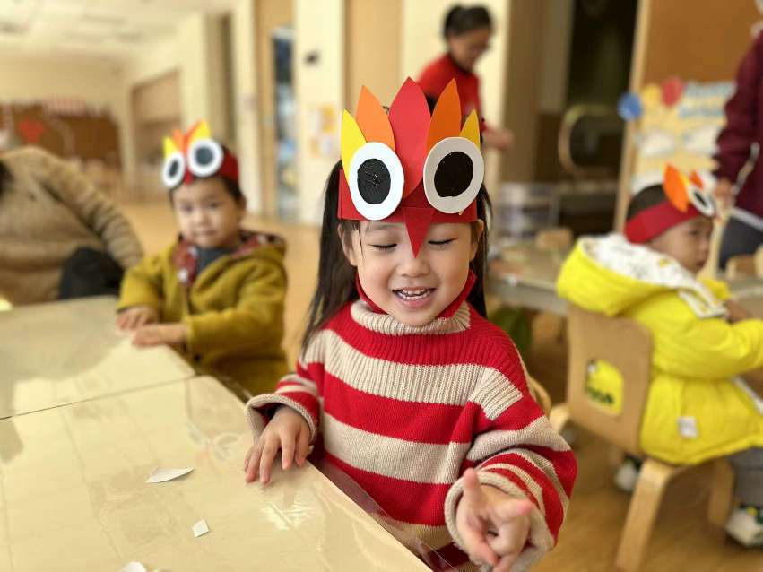 第一节课是制作节日礼帽。在课堂上,孩子们被鼓励着自主选择材料、设计和制作。完成后,每个孩子都兴奋地戴上了自己亲手完成的小帽子,并在老师的引导下,说说自己帽子的设计理念,夸夸同伴帽子的好看之处。