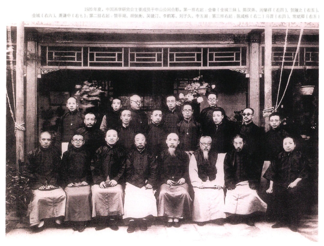 1920年夏,中国画学研究会主要成员于中山公园合影。第一排右起:金章(金城三妹)、陈汉弟、周肇祥(右四)、贺履之(右五)、金城(右六)、萧谦中(右七);第二排右起:管平湖、胡佩衡、吴镜汀、李鹤筹、刘子久、李五湖;第三排右起:陈咸栋(右二)、马晋(右四)、常斌卿(右五)