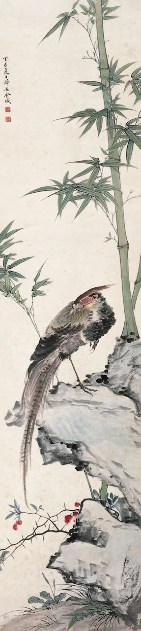 (左)金城《竹石雉鸡》1917年