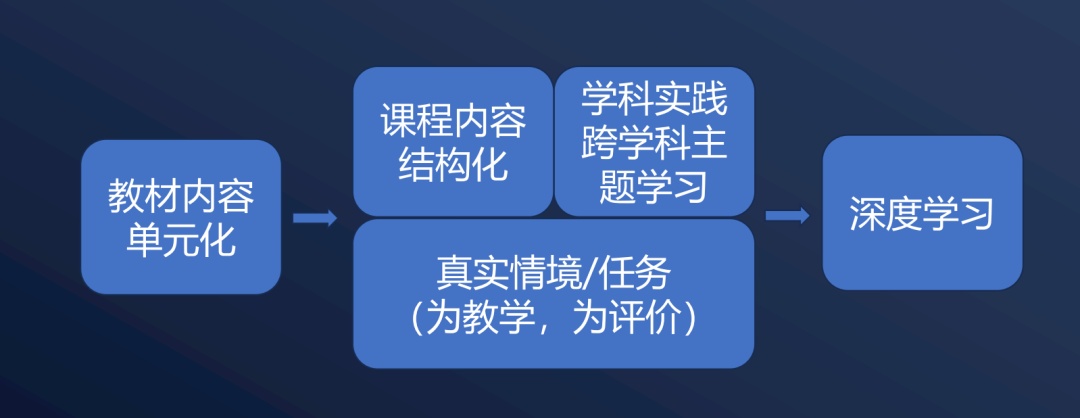 首先教师要把教材内容单元化,也就是课程内容的结构化,进入学科实践或跨学科主题学习,然后再进入真实情境、真实任务,这样才能够实现深度学习。