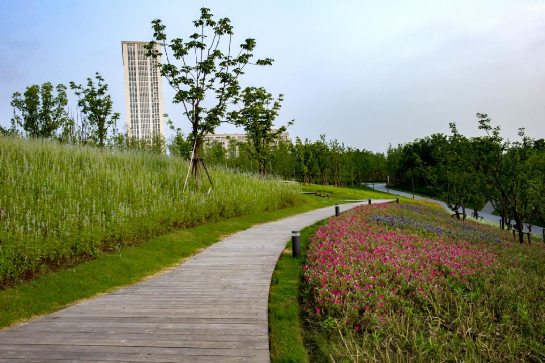 桃浦中央绿地采用行云流水的动态架构,形成山谷意象,以活泼灵动的构图创造出一个优雅独特的绿地,塑造“新自然”景观。