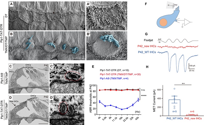 图2.a-b.扫描电镜可观察到在内源内毛细胞损伤的情况下,新生内毛细胞可再生出新的纤毛结构;c-d.透射电镜可观察到新生内毛细胞有囊泡结构的产生;e.但小鼠听力未能得到有效的改善;f-h.电生理技术发现新的内毛细胞不具备机械敏感的met通道电流。