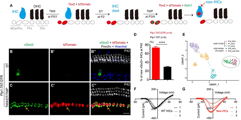 为了探讨再生出的新生内毛细胞是否具有生物学功能,研究人员通过听觉脑干反应检测并比较了plp1-ai9(tmx/tmp,阳性对照组)、plp1-tat-dtr(dt,阴性对照组)和plp1-tat-dtr(tmx/dt/tmp,实验组)三者之间的听力,结果显示实验组小鼠的听力未能得到恢复(图2e)。为了进一步寻找听力不能恢复的主要原因,研究人员利用电生理技术,发现新的内毛细胞不具备机械敏感电转导通道电流(图2f-h)。该发现解释了新的内毛细胞无法感知外界声音信号,无法恢复听力的原因,从而为未来如何再生出有功能的毛细胞提供了方向。