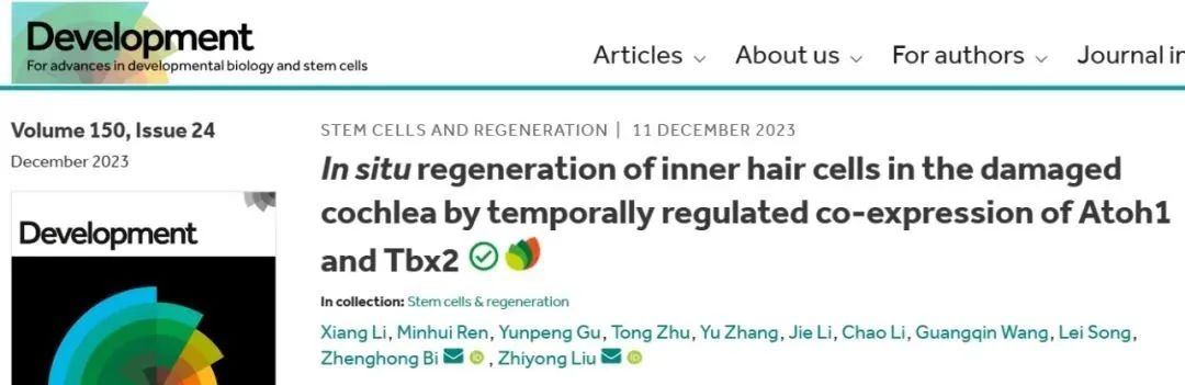 2023年12月11日,《development》杂志在线发表了题为《in situ regeneration of inner hair cells in the damaged cochlea by temporally regulated coexpression of atoh1 and tbx2》的研究论文。该研究由中国科学院脑科学与智能技术卓越创新中心(神经科学研究所)刘志勇研究组完成。研究团队构建了耳蜗内毛细胞特异性损伤的小鼠模型,并在该模型的基础上把幼年耳蜗支持细胞转分化为新的内毛细胞,从而实现了损伤耳蜗内源性内毛细胞后的原位再生,并对新的内毛细胞进行了全面详细的转录组学,形态学和电生理特性等分析。