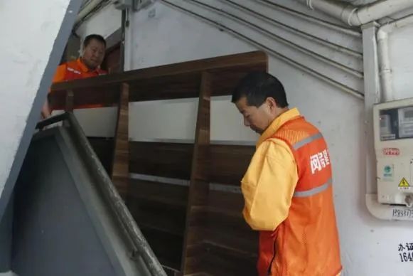 “大件的先搬,小件的后整理……”“我们一起把这个抬下去……”狭窄的空间里,师傅们小心翼翼地搬动着物件。