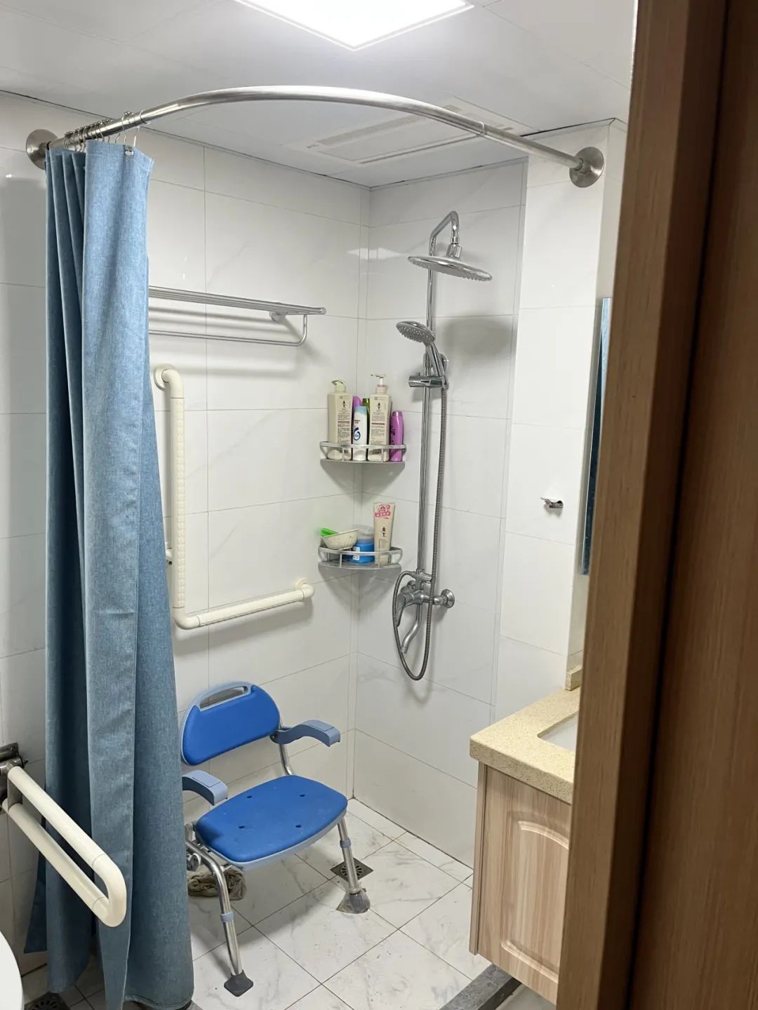“整个改造过程高效又贴心,老房子变‘新’了,如厕洗澡都方便多了。”街道与施工师傅保持密切沟通,耐心解答张阿婆的疑问,持续关注改造进展,及时解决施工中出现的问题,确保改造工作顺利推进。精心改造后,张阿婆家的卫生间“焕然一新”:防滑地砖、l形扶手、淋浴凳、浴巾架、置物架、花洒、浴帘等悉数安装到位,张阿婆和老伴终于可以放心地使用卫生间了。她逢人便讲家中的变化,感激街道暖心的关怀,称赞施工师傅贴心的设计。