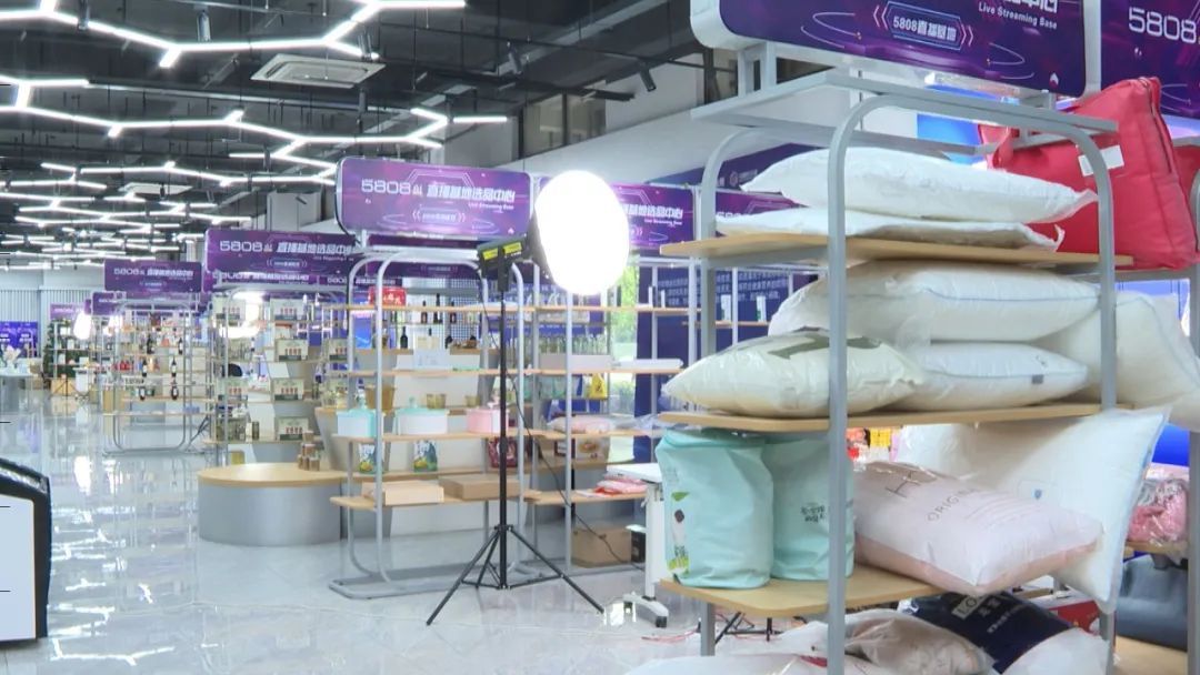 走进直播基地,货架上的商品琳琅满目,多个面积不等的直播间交叉排布,电脑、手机、照明灯等直播设备一应俱全。