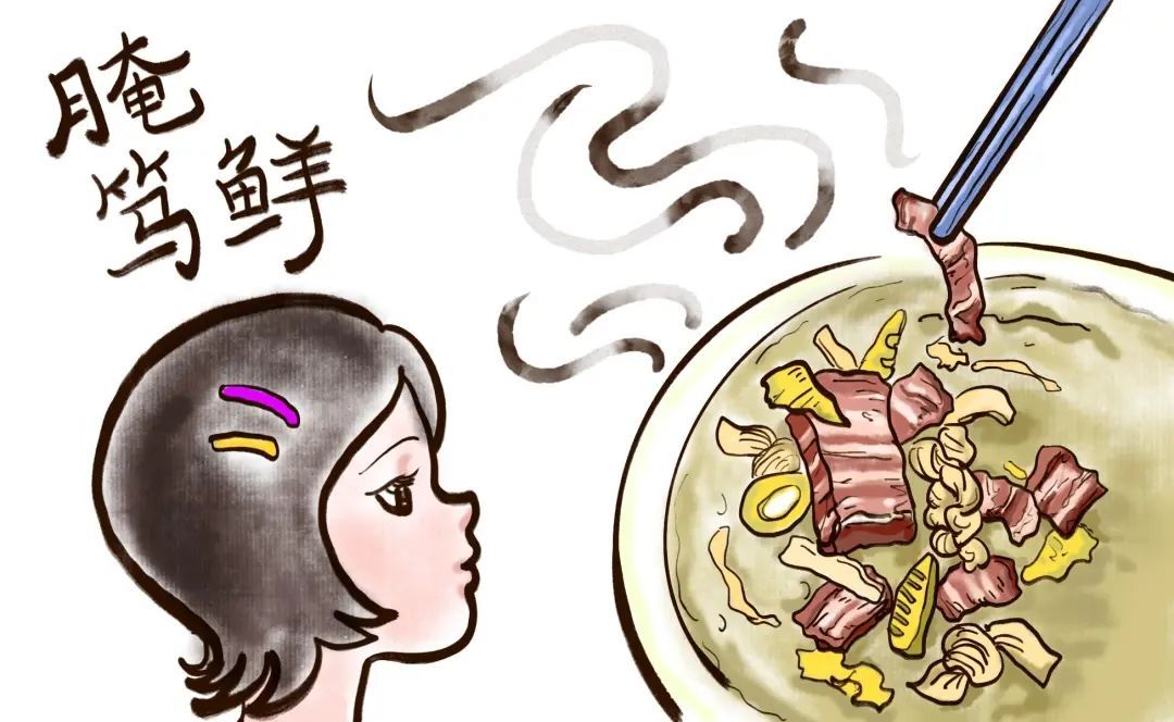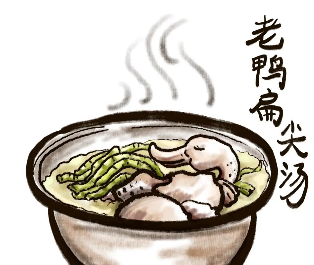老鸭扁尖汤。一整只老鸭下锅,放入扁尖笋一起慢慢炖。无需很多调料,老远就能闻到一股鲜香味。