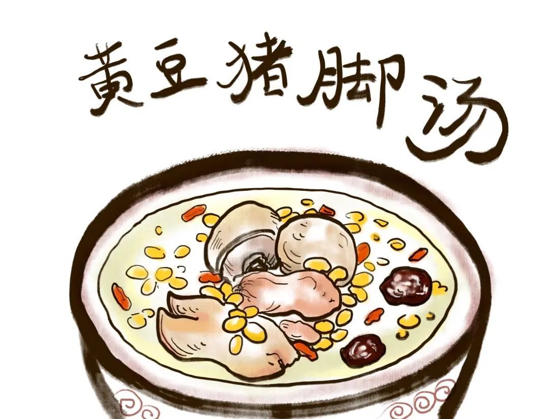 黄豆猪脚汤,也是小时候妈妈们常熬的汤品。一整只干净的蹄髈或切成块,佐以若干黄豆、姜片、葱,只要放上一点盐。文火焖煮,直到汤色熬成奶白色,肉质软绵,黄豆酥烂。喝下去略有黏嘴,有点鲜。再嚼一颗黄豆,糯糯的。在以前,这碗汤可是大补之物。