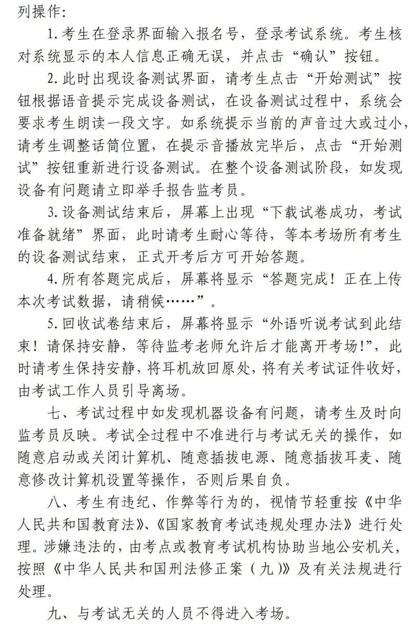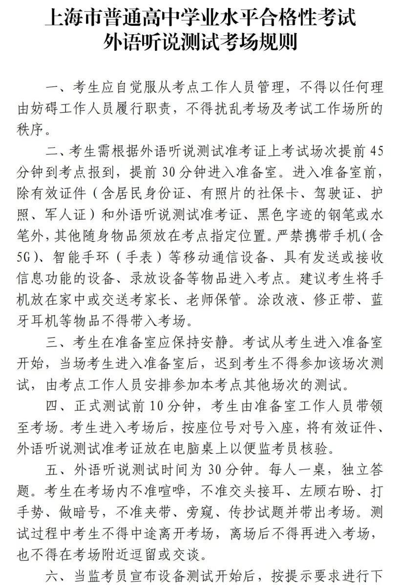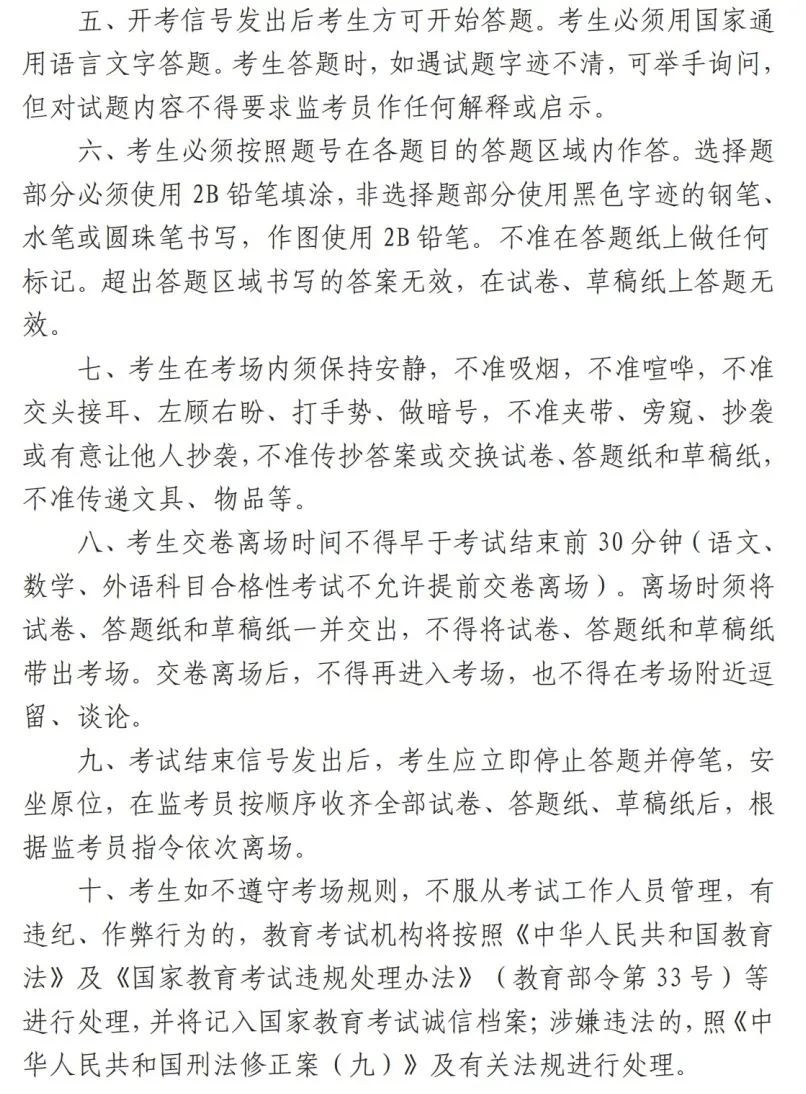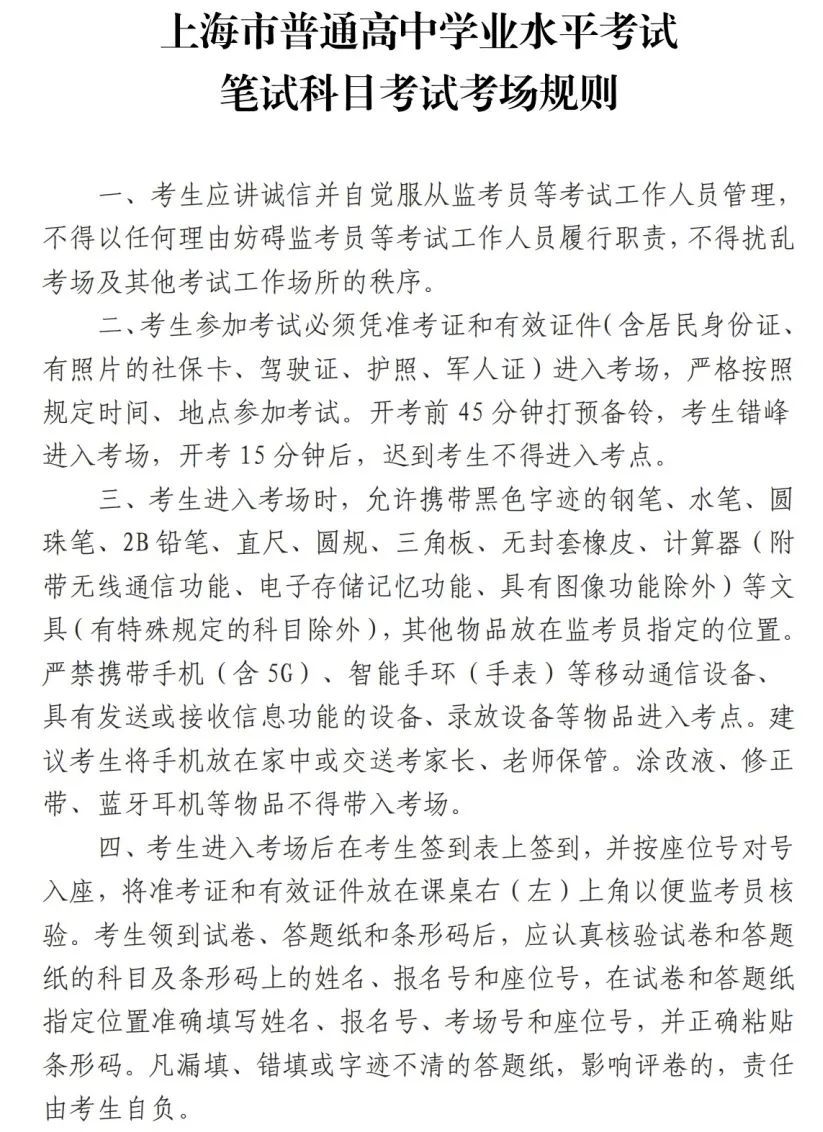 2.请考生仔细阅读《上海市普通高中学业水平考试笔试科目考试考场规则》(附文末)和《上海市普通高中学业水平合格性考试外语听说测试考场规则》(附文末),严格按照考场规则参加考试。考试期间若有违规、违法行为,将参照《国家教育考试违规处理办法》(教育部令第33号)(摘要)或《中华人民共和国刑法修正案(九)》(摘要)严肃处理。