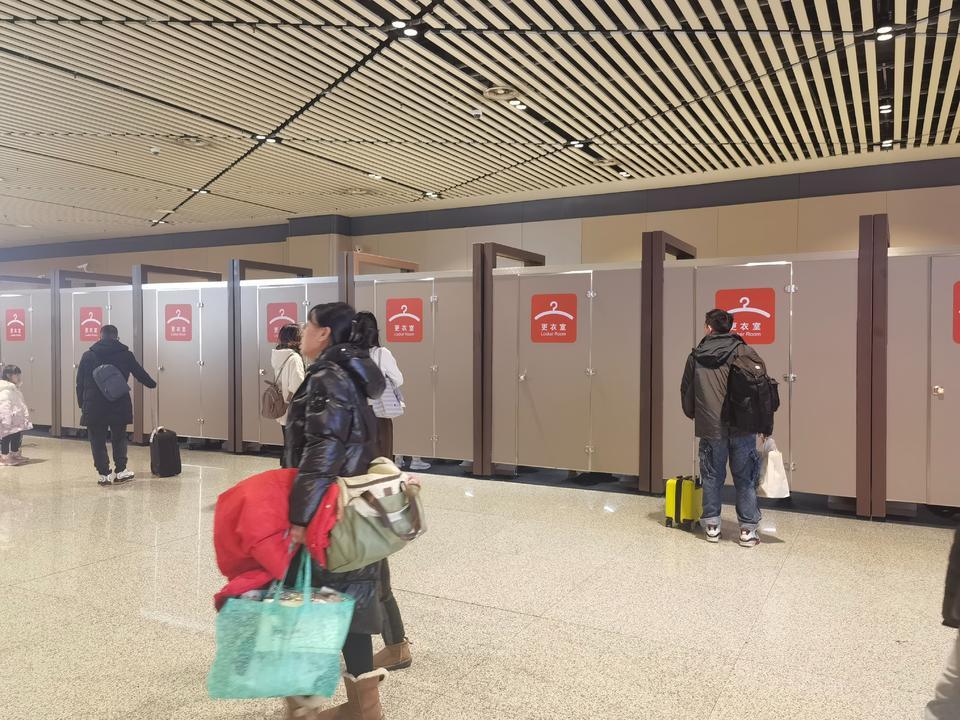 再往机场里面走,是一排更衣室。更衣室整体干净卫生,内部挂有金色的鹿和石头挂画,寓意畅行无阻、一帆风顺。但记者发现,由于来哈人员较多,使用更衣室基本需要等待五到十分钟。还有过路的本地人直呼“哈尔滨现在都安排这玩意了。”