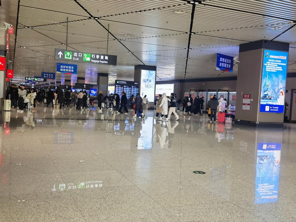 在哈尔滨太平国际机场,大批游客为此次旅行做了充分准备,他们穿着长筒棉鞋、头顶大棉帽,里里外外套着好几件棉衣来到哈尔滨。