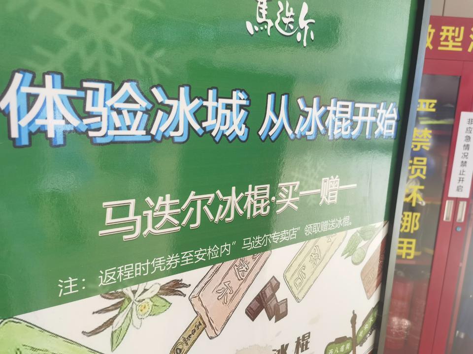 在“温暖驿站”旁边是哈尔滨中央大街特产马迭尔雪糕的大冰柜。今年1月10日,马迭尔冰棍推出“买一赠一”活动。机场工作人员介绍,“买一赠一”不是当时就能得到两根冰棍,而是先得到一根冰棍和一张兑换券,返程时在机场马迭尔专卖店领取赠送的冰棍。