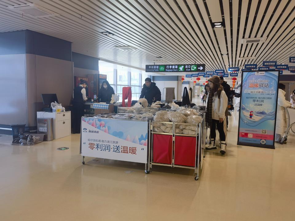 机场大厅的角落处,立着“温暖驿站”的牌子,这是为了迎接外地游客刚刚推出的活动,主打“零利润”。帽子有35元的、69元的,围巾有40元的、68元的,手套39元。记者发现,驿站里的帽子、围巾等商品都相当厚实,摸上去毛茸茸的,是室外必备“过冬神器”。