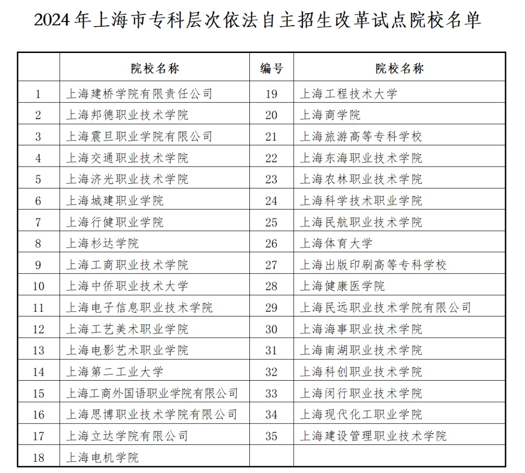 近日,上海市教委印发《2024年上海市部分普通高校专科层次实行依法自主招生改革试点方案》,今年共有35所院校参加专科层次依法自主招生,志愿填报将于3月8日开始,每个考生只能填报1所院校志愿。