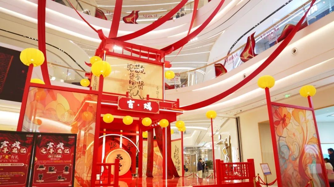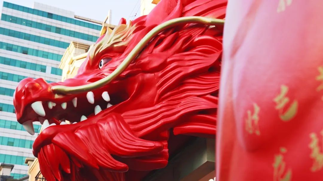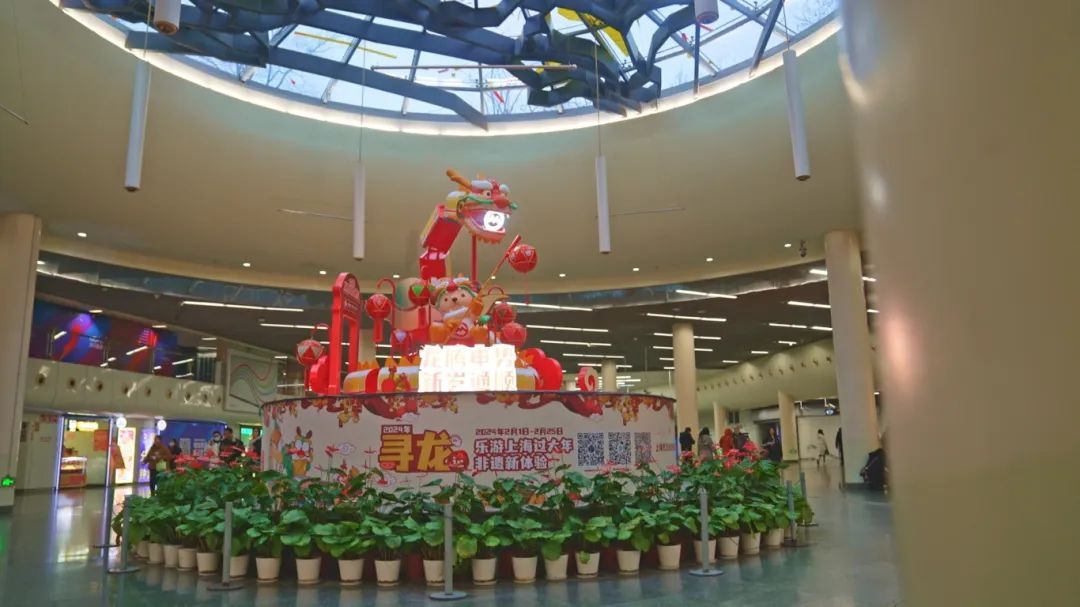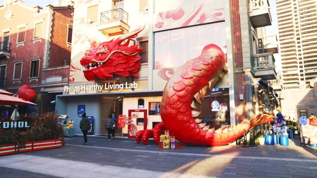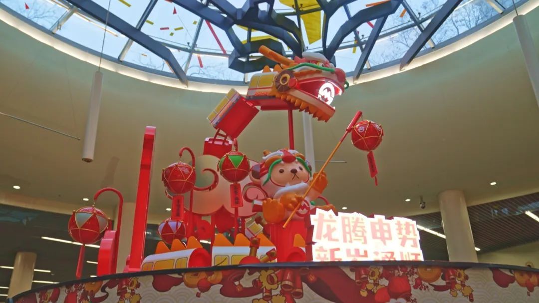 充满年味的红金配色,高贵霸气的游龙造型,栩栩如生的细节展示,龙头到龙尾整整占据了两层楼,惟妙惟肖,气势磅礴,颇为吸睛,不少路过的市民纷纷驻足拍照。