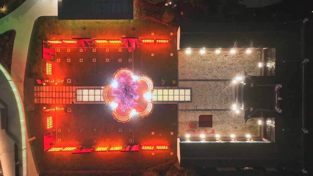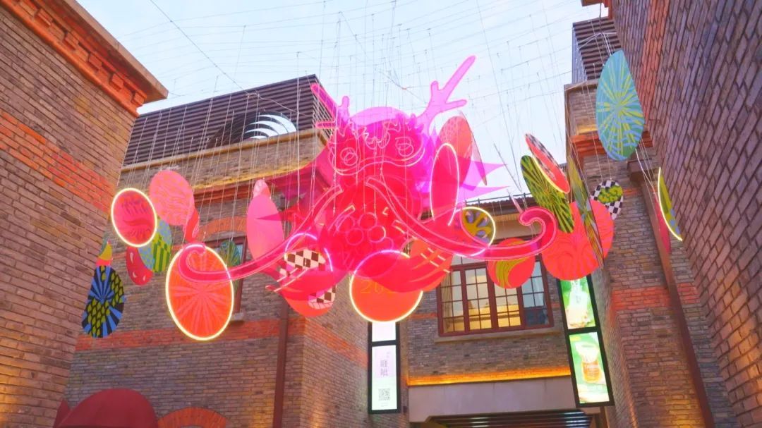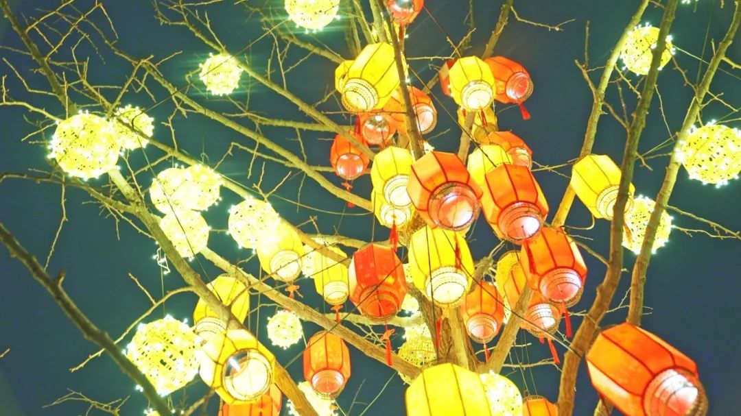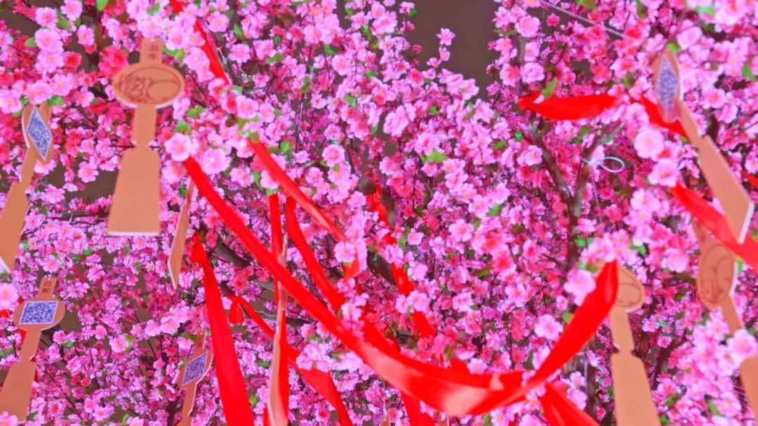 人们可以在树下互赠新年祝福,通过互动扫码,在流光异彩中探寻个人专属祝福语与幸运之色,在“十里桃花”的花灯掩映中交织新春图景,复刻千百年前东方年味。
