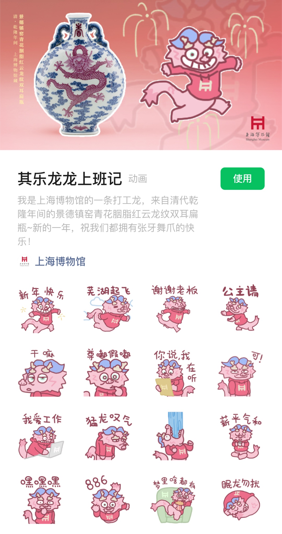龙是想象中的奇妙生灵,它可以神秘威严,也可以“萌萌哒”~上海博物馆根据馆藏文物“景德镇窑青花胭脂红云龙纹双耳扁瓶”上的龙形象,推出“其乐龙龙上班记”趣味表情包,让我们和“小粉龙”一起,拥有张牙舞爪的快乐吧!