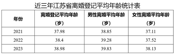 2023年全省离婚登记平均年龄为38.98岁,其中男性39.83岁、女性38.13岁。