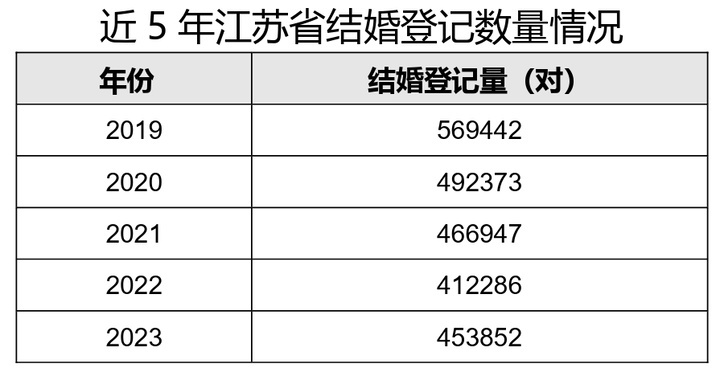 交汇点讯 记者2月13日从江苏省民政厅获悉,2023年,江苏民政部门共办理结婚登记453852对(含补办登记62400对),其中,内地居民结婚登记452273对,涉外、涉港澳台居民及华侨婚姻登记1579对。结婚登记量2019年至2022年呈逐年下降趋势,2023年较2022年有所回升,增长约10.08%