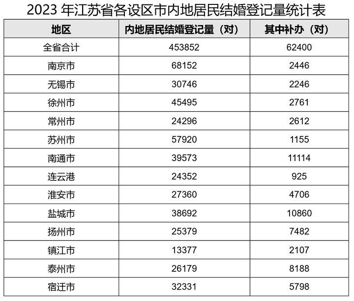从内地居民结婚登记地域分布情况看:南京市、苏州市、徐州市结婚登记量位居全省前三。