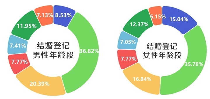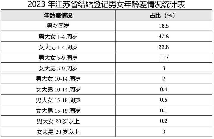从2023年全省结婚登记男女年龄差看:男性较女性大1-4周岁的最多,占比达42.8%;女性较男性大1-4周岁的占比第二,为22.8%;男女同龄占比第三,为16.5%。