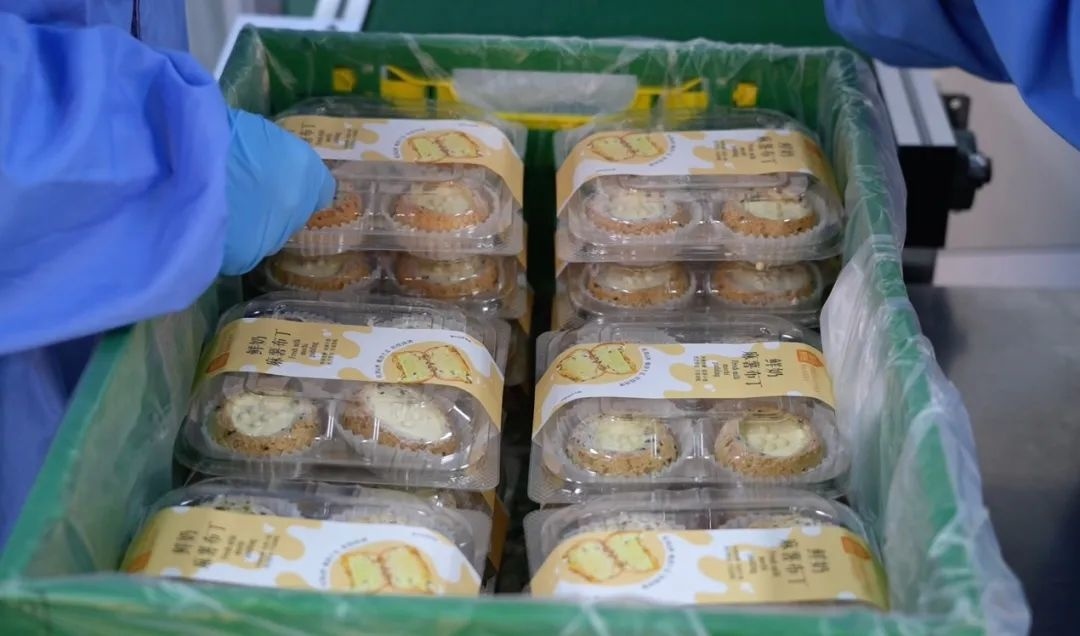 在廊下镇上海唐满胜食品有限公司的生产车间里,工人们忙碌地整理、打包各类新鲜烘焙产品,企业每天生产地6000多份烘焙产品,将运往盒马生鲜、泸溪河等企业门店。