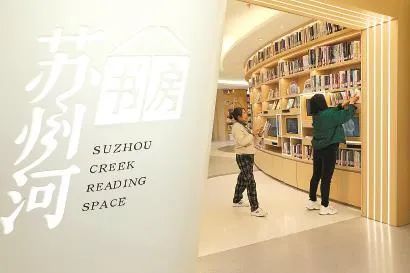 在位于中远两湾城的半马苏河驿站·1690党群服务中心,工作人员正在“苏河书房”陈设书籍与展品。