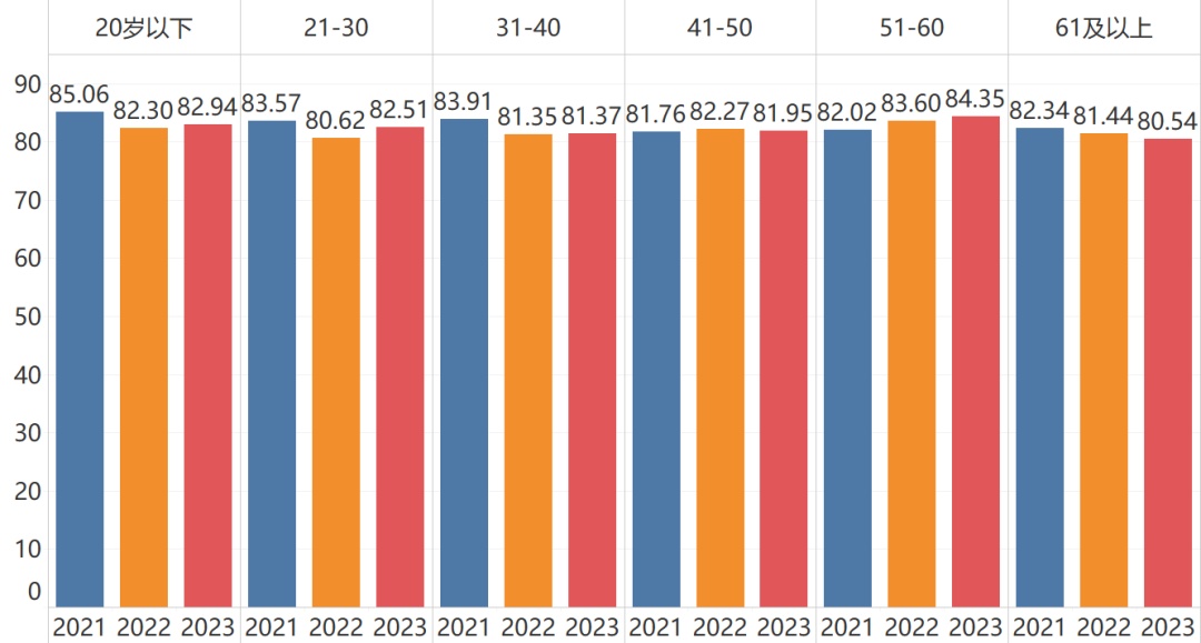 2023年,满意度最高的消费者群体变仍为51-60岁的消费者,达到了84.35分,所有年龄段在这三年间的消费者满意度均保持在80分以上,这表明无论年龄大小,消费者对市场上的商品和服务普遍持有较高的满意度。