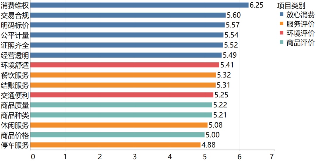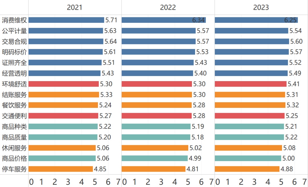 2023年上海市消费环境细分得分情况与前几年相一致,服务类项目和商品评价的评分整体得分较低,说明未来还是需要加强服务水平建设和提升商品品质。