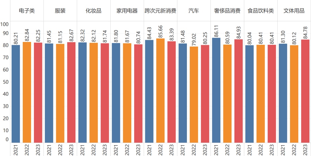 2023年,奢侈品消费、文体用品行业和跨次元新消费行业进入各行业消费者满意度的前三名。所有行业的消费者在三年内的满意度都维持在79分以上,这说明市场上的商品和服务普遍得到了各行业消费者的认可。